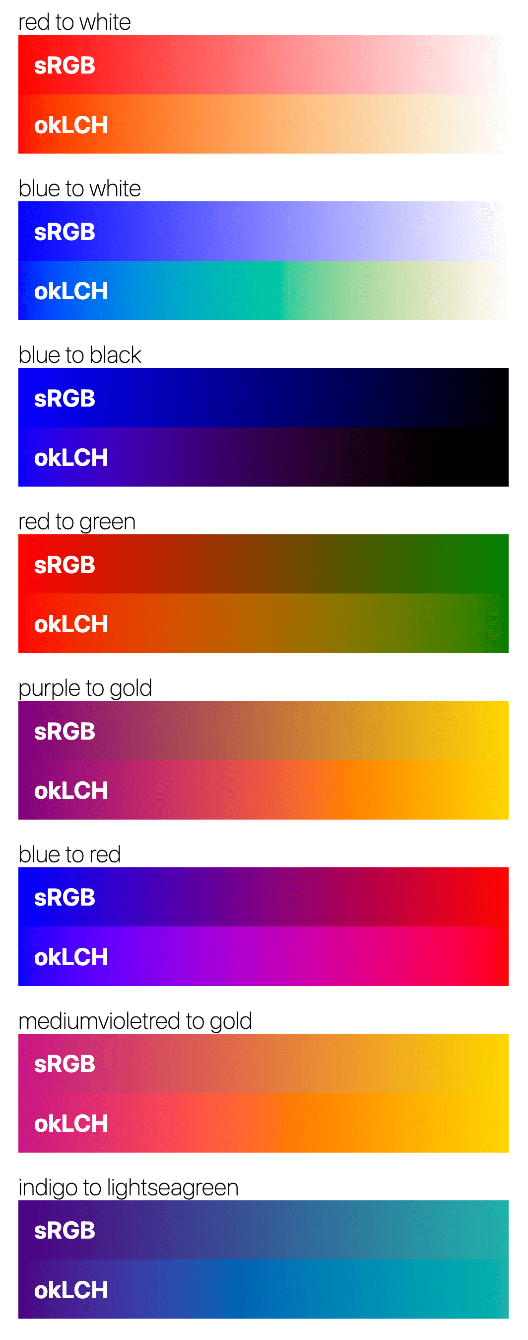 I thought that OKLCH was supposed to be a majorly clear winner with interpolating gradients, but I’m not so sure. It’s true that it generally avoids “the gray dead zone”, but sometimes it does so by travelling through some other very unexpected color territories. More vibrant? Usually. More intuitive? Nope.